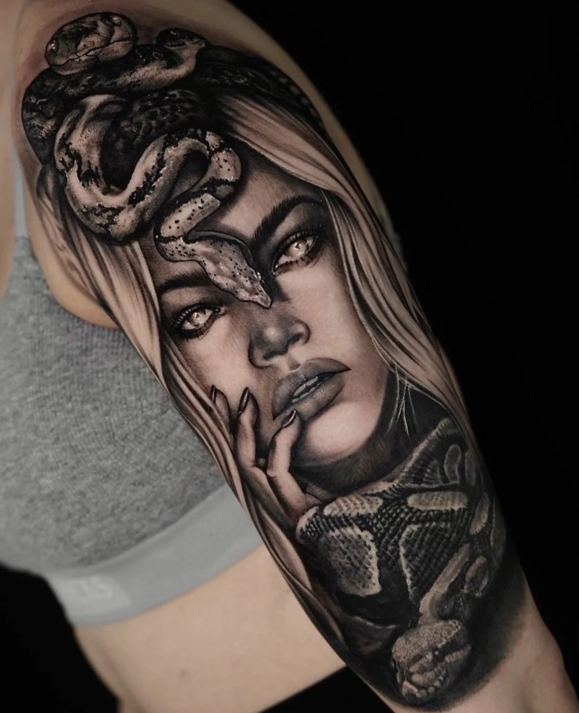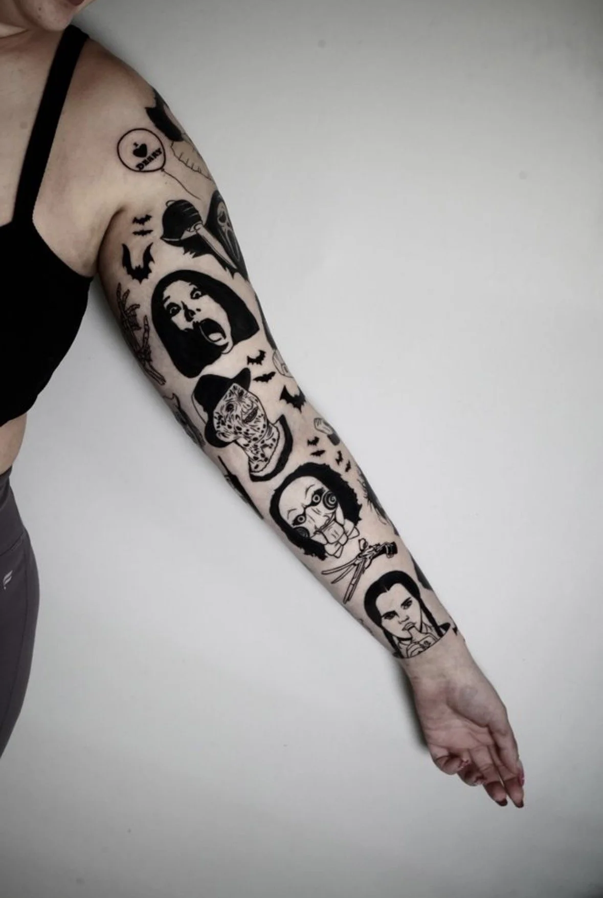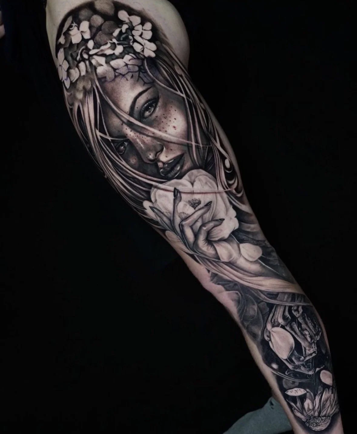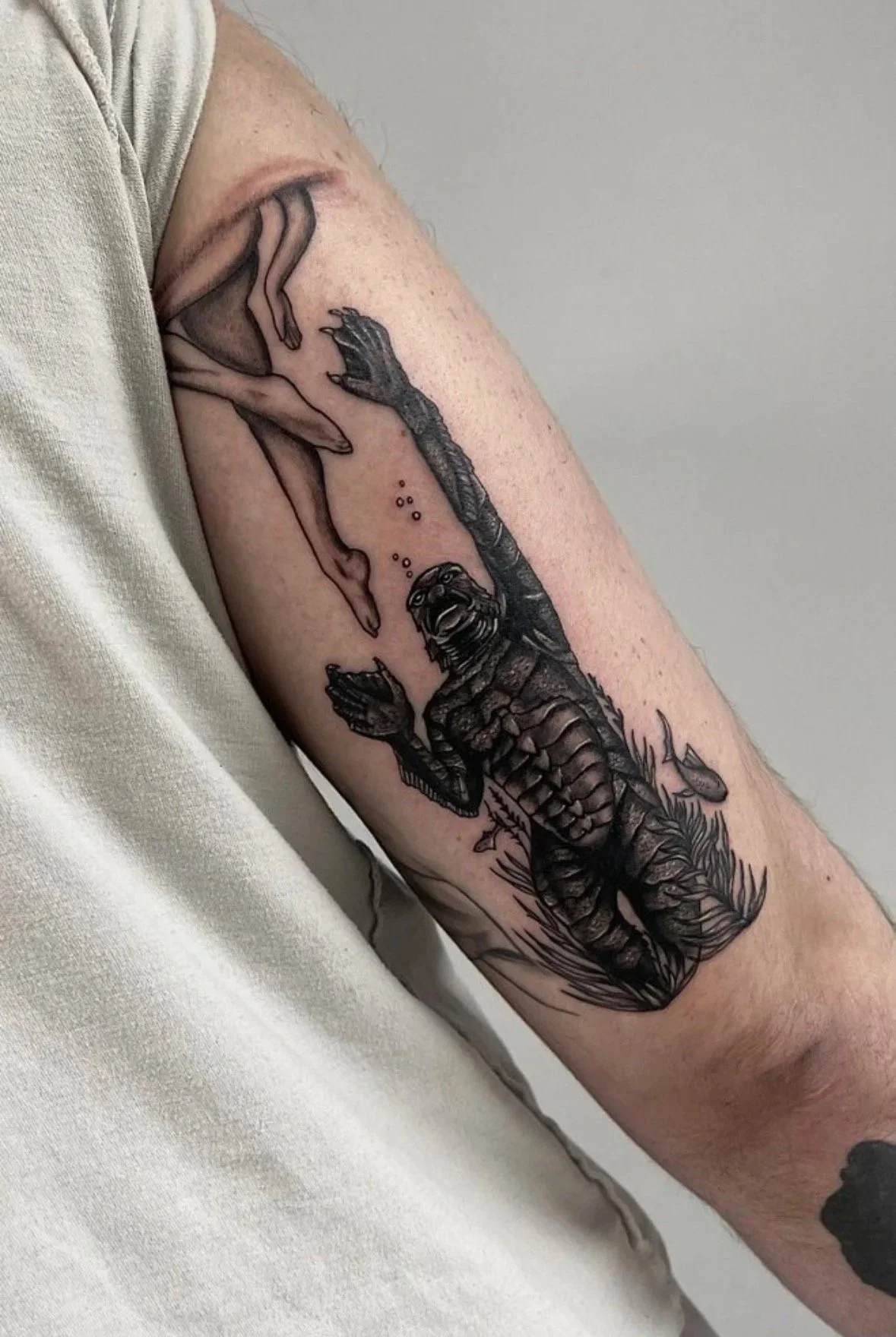After moving to New Jersey, she worked long hours in hospitality management before studying audio production at the Institute of Audio Research in New York City and working live sound. Eventually, tattooing took over, though she still plays guitar, writes songs, and occasionally performs at local open mics. She’s been tattooing for eight years, specializing in portraits and darker, atmospheric imagery.